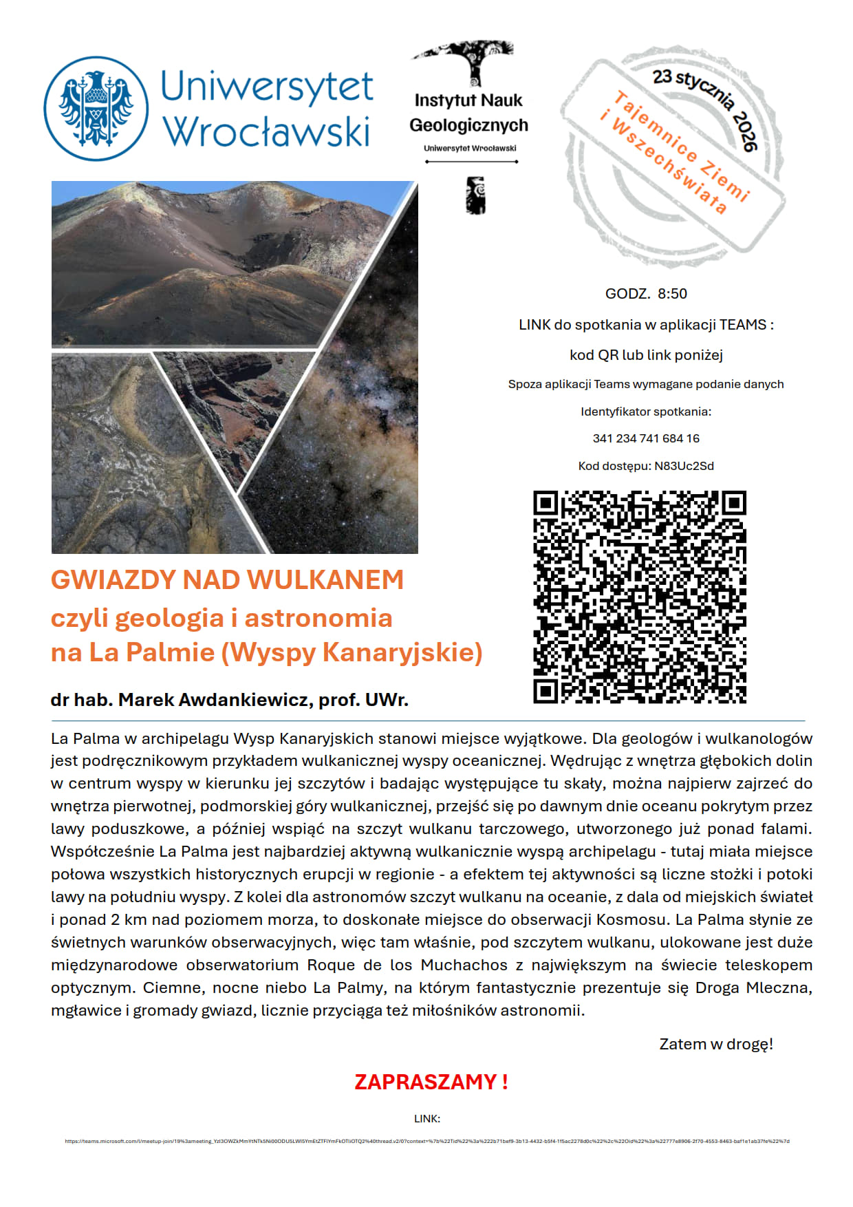 Wędrując z wnętrza głębokich dolin w centrum wyspy w kierunku jej szczytów i badając występujące tu skały, można najpierw zajrzeć do wnętrza pierwotnej, podmorskiej góry wulkanicznej, przejść się po dawnym dnie oceanu pokrytym przez lawy poduszkowe, a później wspiąć na szczyt wulkanu tarczowego, utworzonego już ponad falami. Współcześnie La Palma jest najbardziej aktywną wulkanicznie wyspą archipelagu – tutaj miała miejsce połowa wszystkich historycznych erupcji w regionie – a efektem tej aktywności są liczne stożki i potoki lawy na południu wyspy. Z kolei dla astronomów szczyt wulkanu na oceanie, z dala od miejskich świateł i ponad 2 km nad poziomem morza, to doskonałe miejsce do obserwacji Kosmosu. La Palma słynie ze świetnych warunków obserwacyjnych, więc tam właśnie, pod szczytem wulkanu, ulokowane jest duże międzynarodowe obserwatorium Roque de los Muchachos z największym na świecie teleskopem optycznym. Ciemne, nocne niebo La Palmy, na którym fantastycznie prezentuje się Droga Mleczna, mgławice i gromady gwiazd, licznie przyciąga też miłośników astronomii.