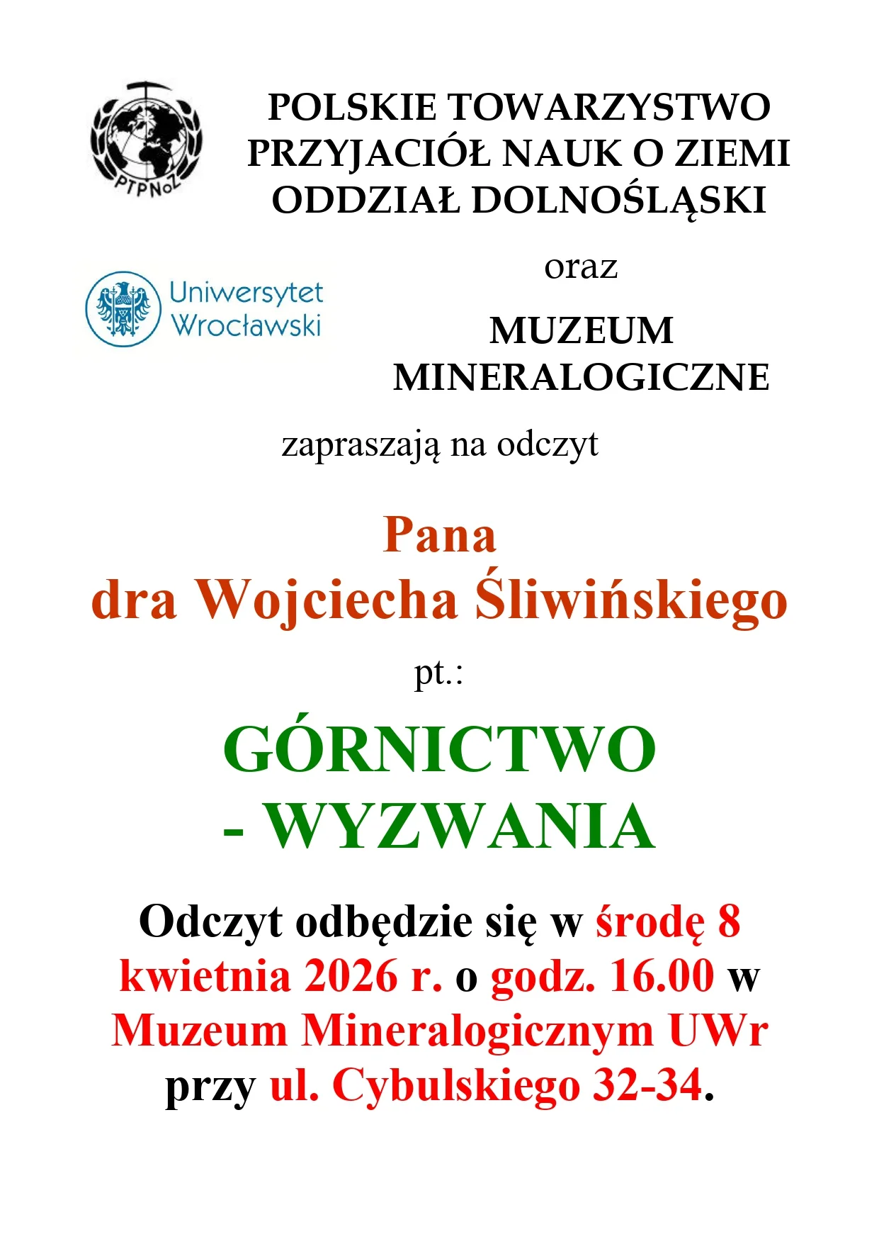 PTPNoZ oraz Muzeum Mineralogiczne zapraszają na odczyt dr. Wojciecha Śliwińskiego pt.: "Górnictwo - Wyzwania"